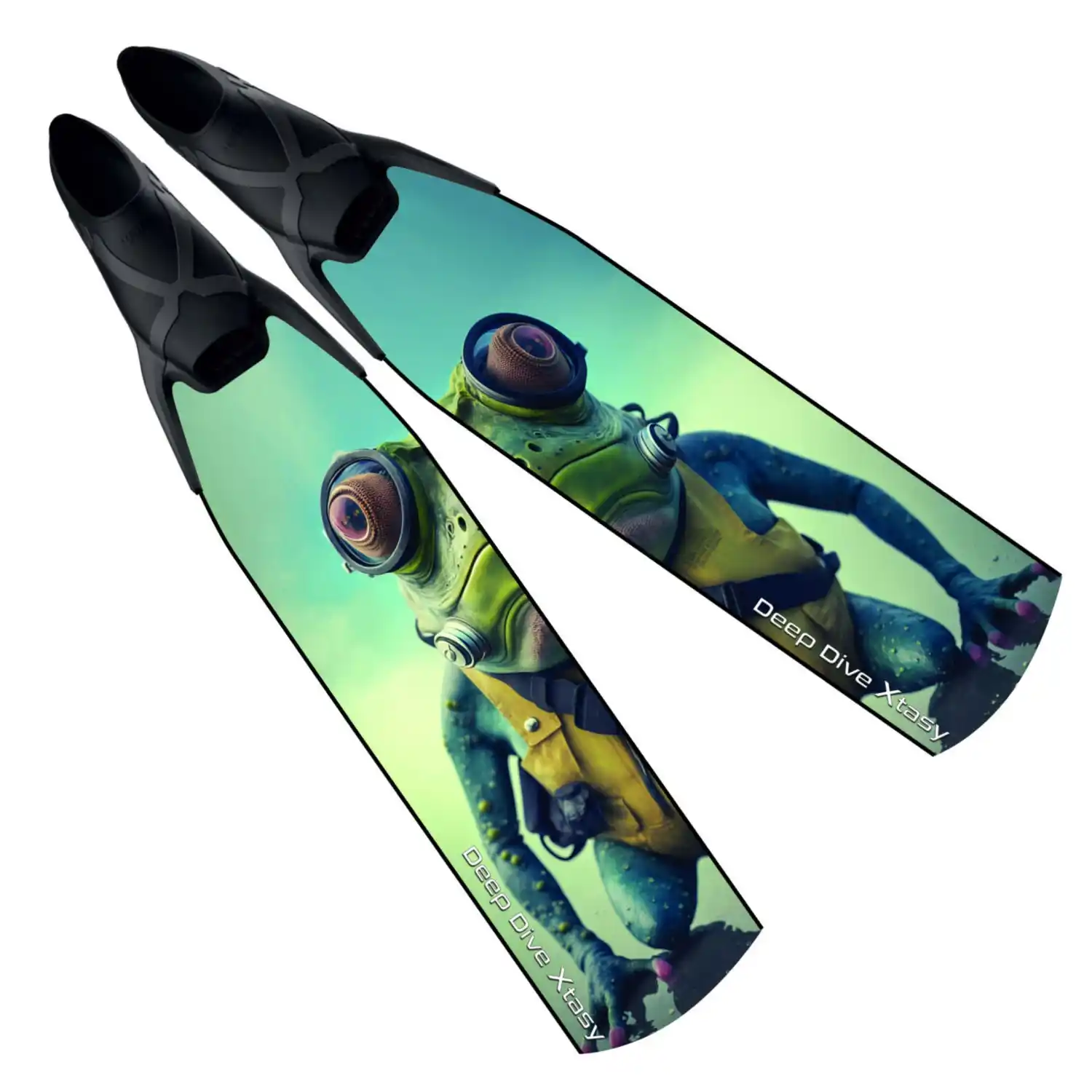 Fins de alta calidad fabricadas con fibra de vidrio de grado aeroespacial por Deep Dive Xtasy, con un exclusivo diseño Frogonaut. El arte se imprime directamente sobre la fibra utilizando tintas UV especializadas antes del proceso de infusión, asegurando que se mantenga vibrante y resistente a los arañazos con el tiempo.