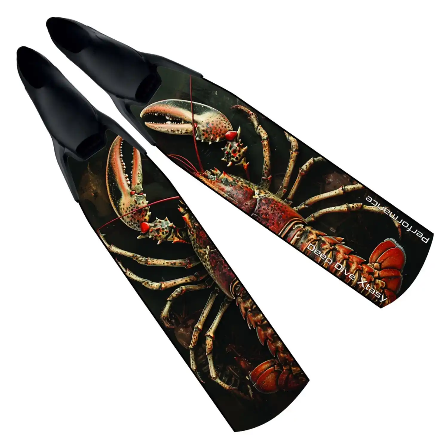 Finas de carbono de alta calidad de grado aeroespacial de Deep Dive Xtasy, con un exclusivo diseño de Langosta. El arte se imprime directamente sobre la fibra utilizando tintas UV especializadas antes del proceso de infusión, asegurando que se mantenga vibrante y resistente a los arañazos con el tiempo.
