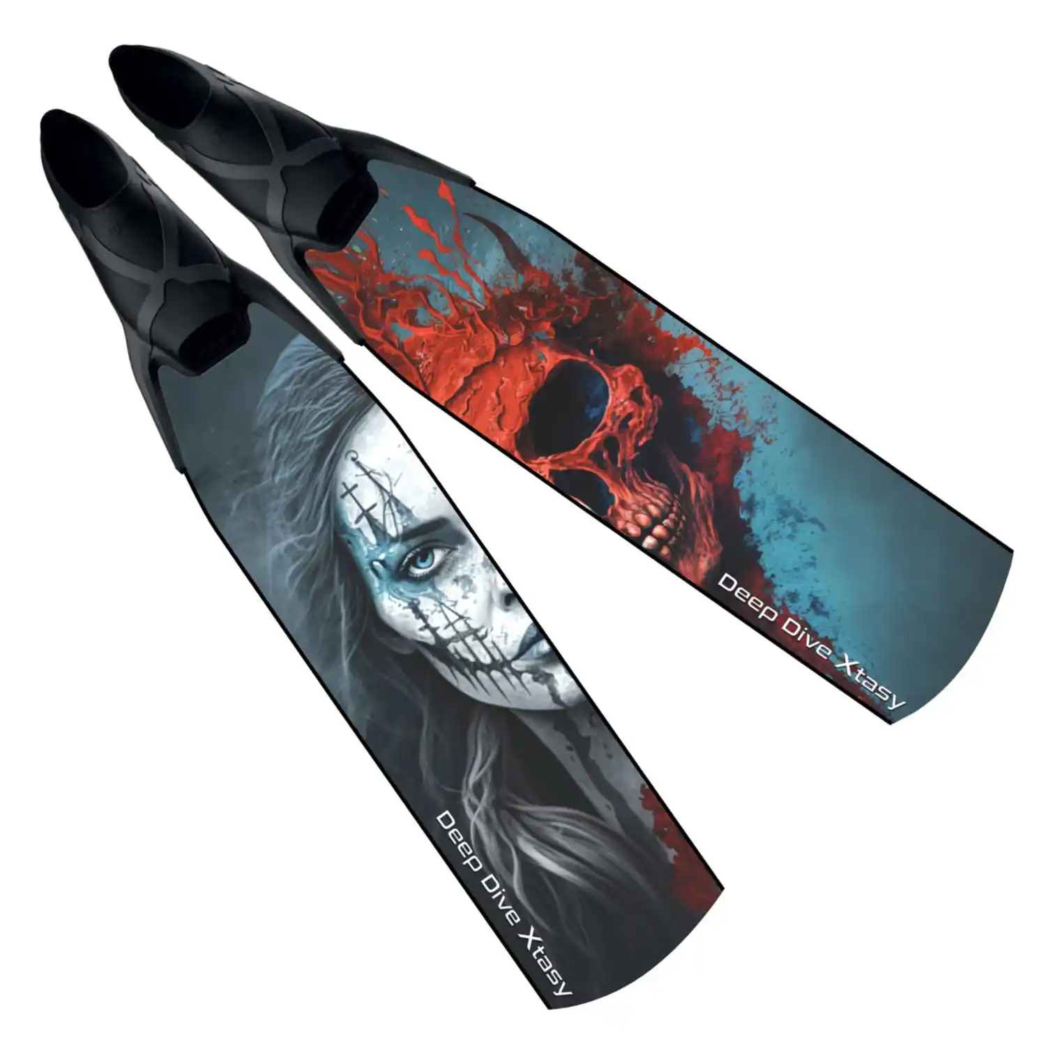 Finas de carbono de calidad aeroespacial de alta calidad de Deep Dive Xtasy, con un exclusivo diseño Skullbelle. El arte se imprime directamente sobre la fibra utilizando tintas UV especializadas antes del proceso de infusión, asegurando que permanezca vibrante y resistente a los arañazos con el tiempo.